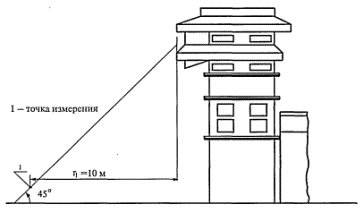 где a - коэффициент звукопоглощения, дБ/м, определяемый по Приложению Б. 9.4 Определение уровней звуковой мощности элементов ГПА 9.4.1 Для газотурбинных ГПА (в индивидуальных зданиях, в общем здании и в блочно-контейнерном исполнении) определяются, в соответствии с ГОСТ 23941, уровни звуковой мощности в октавных полосах частот и корректированный по характеристике А уровень звуковой мощности следующих элементов: всасывающего тракта; выхлопной системы; газотурбинного привода; нагнетателя газа; технологической обвязки нагнетателя газа. 9.4.2 Точки измерения уровней звукового давления на рабочих режимах назначают: на расстоянии r от среза воздухозаборной камеры под углом 45°; на расстоянии r от среза выхлопной шахты (дымовой трубы) под углом 45°; около привода (турбогруппы или двигателя в кожухе) в индивидуальных и общих зданиях; около нагнетателя и у патрубков нагнетателя; у технологической обвязки нагнетателя. 9.4.3 Точки измерения в количестве не менее восьми назначают равномерно на измерительной поверхности элементов ГПА. 9.4.4 Во всех случаях расстояние r определяется местными условиями размещения оборудования и указывается в протоколе измерений. В соответствии с программой обслуживания могут быть назначены дополнительные (кроме указанных выше) места (точки) измерения уровней звукового давления и уровней звука. 9.4.5 Для электроприводных ГПА в цеховом исполнении в индивидуальных укрытиях назначаются следующие шумовые характеристики: уровень звуковой мощности двигателя; уровень звуковой мощности нагнетателя; уровень звуковой мощности технологической обвязки нагнетателей. 9.4.6 Если разность между максимальными и минимальными уровнями звука превышает 8 дБ (дБА), назначаются дополнительные восемь точек измерения, расположенные между основными точками. 9.4.7 Точки измерения шума следует располагать на расстоянии 1 м от звукоактивной поверхности оборудования на высоте 1,5 м от уровня поверхности территории. 9.5 Определение шумовых характеристик на рабочих местах 9.5.1 Перед началом испытаний определяют зоны воздействия шума ГПА для постоянных рабочих мест на территории КС и назначают в них контрольные точки измерений уровней звукового давления и уровней звука (рисунки 1-9). 9.5.2 Для непостоянных шумов должны быть определены эквивалентные уровни звука LАэкв, дБА, в соответствии с ГОСТ 12.1.050. 9.5.3 Для непостоянных рабочих мест необходимо определить маршрут обслуживания агрегата и время пребывания работников в рабочих зонах. 9.5.4 Для газотурбинных ГПА в цеховом исполнении точки измерения уровней звука в зонах обслуживания назначают: - на расстоянии 10 м от среза воздухозаборного устройства под углом 45° к горизонту - одна точка (рисунок 1); - на расстоянии 20 м от среза воздухозаборного устройства под углом 45° к горизонту - одна точка (рисунок 2); - у технологической обвязки нагнетателя со стороны всасывания - две точки (точки 1, 2, показанные на рисунке 3); - у технологической обвязки нагнетателя со стороны нагнетателя - две точки (точка 3, 4, показанные на рисунке 3); - около привода (ПТУ в кожухе) в зданиях - две точки (точки 5, 7, показанные на рисунке 3); - около нагнетателя (одна точка) и у патрубков нагнетателя - две точки (точки 8-10, показанные на рисунке 3).