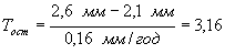 где с - глубина коррозионного повреждения на момент измерения, мм; t - срок эксплуатации газопровода до проведения измерений, год. Величину остаточного ресурса Тост, год, вычисляют по формуле