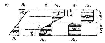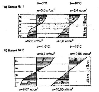 Рис. 1.5. Экспериментальные эпюры напряжений при изгибе ледяных балок На основании проведенных экспериментов и используя данные К.Ф. Войтковского [29], можно сделать следующие выводы о распределении напряжений по толщине ледяного слоя при изгибе: а) при загружении ледяного слоя кратковременно действующей нагрузкой (от нескольких секунд до одной минуты), при отрицательной температуре воздуха и льда -10°С и ниже, закон распределения напряжений близок к упругому (рис. 1.5,а). В этом случае почти справедлив закон Гука; б) при загружении ледяного слоя нагрузкой, действующей продолжительное время (от 10 минут до нескольких часов) при устойчивой отрицательной температуре, а также при кратковременно действующей нагрузке при температуре воздуха и льда, близкой к 0°С, явно проявляются пластические деформации. В этом случае экспериментальная эпюра напряжений имеет вид (рис. 1.5, а,б). Учитывая вышеизложенные выводы и закономерность распределения температуры в толще льда, можно предложить следующие расчетные эпюры распределения напряжений по толщине ледяного слоя (рис. 1.6).