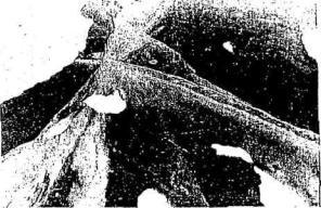 Рис. 1.9. Температурные трещины в ледяном покрове Из ста замеров глубин незамерзшей части трещин 75% имели глубину 3÷7 см, 23% - глубину 8÷12 см, и 2% - 20÷22 см. В период оттепели 25 января трещины частично или полностью заполнялись талой водой, а затем, при понижении температуры/замерзали. Наблюдения за ледяным покровом этого же озера были продолжены ив январе 1974 г. Ввиду продолжительной теплой погоды и декабре 1973 г. весь снежный покров на озере превратился в слой снежного льда толщиной 6 см, который лежал сверху основного слоя прозрачного льда толщиной 30 см. В этом случае температурными трещинами был довольно интенсивно разрушен только верхний слой - слой снежного льда. Температура наружного воздуха в период наблюдений не превышала -15°С. При этом основной слой прозрачного льда, лежащий под верхним слоем, температурных трещин почти не имел. Наблюдения за льдообразованием на этом же водоеме были повторены в зиму 2003-2004 гг. Этот период характерен относительно теплой и малоснежной погодой, что позволяет считать полученные результаты полезными. График наблюдений велся ежедневно с 1 декабря 2003 г. по 15 марта 2004 г. с фиксацией среднесуточной температуры воздуха. Замеры глубин снежного покрова и толщины льда производились еженедельно. Результаты наблюдений обобщены в графике на рис. 1.10.
