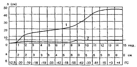 Рис. 1.10. График наблюдений за образованием льда на водоеме с медленным течением: 1 - общая толщина льда (см); 2 - толщина мутного льда (см); а - толщина снежного покрова на льду; б - средняя температура воздуха за неделю Замеры производились в течение 15 недель, следовательно, за расчетный период сумма отрицательных среднесуточных температур воздуха составляет Σt = 396°С. Для определения скорости нарастания льда (в сантиметрах) в естественных условиях под снежным покровом в водоемах с медленным течением возможно применение формулы Наймана [128]