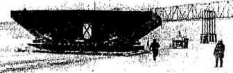 Рис. 1.13. Подъем блоков балки жесткости с ледовой строительной площадки Подъем и установка блоков балки жесткости в проектное положение в русловой части выполнялись специальным монтажным агрегатом (рис. 1.12 и 1.13), который был изготовлен с использованием элементов крана УМК-2, имевшегося и Мостострое-11. Представляют интерес основные технические характеристики агрегата: грузоподъемность 82 т, вылет на горизонтальной площадке 7,4 м. Блок поднимали до совмещения уровней верхних плит монтируемого блока и балки жесткости двумя грузовыми полиспастами агрегата с помощью двух траверс. Конструкция траверс, исключавшая возможность помех при проведении стыковочных работ, состояла из двутавровых балок, четырех тяжей, проходивших через специальные отверстия в верхней плите монтируемого блока, и двух балок, которые подхватывали блок под продольными ребрами верхней плиты. Траверсы крепились на монтируемом блоке еще до подачи его в пролет. Поперечный уклон блока обеспечивали поочередной работой грузовых полиспастов агрегата. Следует отметить, что расстояние между траверсами, равное 6 м, оказалось явно недостаточным и это затруднило устранение перекосов блоков при их установке. После подъема блока до проектной отметки регулировку его положения в плане осуществляли ручными лебедками, располагаемыми внутри коробки на конце смонтированной части консоли. В итоге проектное положение каждого блока фиксировалось путем прикрепления его заднего конца с помощью передвижных подмостей к консоли, а переднего - двумя вантами наперед заданной длины к пилону. Операции прикрепления навешиваемого блока к консоли проводили в таком порядке. В первую очередь, наверху устанавливали двухсторонние накладки на вертикальных участках обоих бортов блока. После этого грузовыми полиспастами корректировали высотное положение свободного конца блока для обеспечения проектного положения блока и затем фиксировали его положение понизу установкой пары двухсторонних накладок, соединяющих нижние плиты. Для крепления двух верхних накладок использовали 40 высокопрочных болтов диаметром 22 мм и 8 пробок, для нижних накладок - 20 болтов и также 8 пробок. Далее выполняли следующие операции: затяжка гайковертами стяжных болтов первоочередных накладок на усилие, составляющее 60-70% от проектного; геодезический контроль проектного положения установленного блока; устройство монтажного сварного стыка по верхней плите; закрепление вантами свободного конца блока; переезд подмостей на сечение стыка и установка с них всех стыковых накладок и болтов (в среднем 1900 на стык) и натяжение их гайковертами на усилие, составляющее 60÷70% от проектного; натяжение вант гидроцилиндрами до расчетного усилия; натяжение всех стыковых болтов динамометрическими ключами до проектного усилия; перекладка путей и перемещение монтажного агрегата по смонтированному блоку на следующую позицию; монтаж ветровых обтекателей. ГЛАВА 2. УЧЕТ НЕУПРУГОГО СОПРОТИВЛЕНИЯ ЛЬДА ПРИ РАСЧЕТЕ ЛЕДЯНОГО ПОКРОВА НА КОЛЕБАНИЯ2.1. Общие сведения о природе поглощения энергии колебаний в твердом материалеПри колебаниях конструкций получаемая ими извне энергия частично расходуется материалом конструкции на неупругие (необратимые) деформации и преобразуется в тепло [153]. Свойство материалов поглощать и рассеивать в 