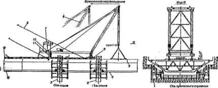 Рис. 1.12. Схема монтажа блоков: 1 - передвижные подмости; 2 - передвижные подмости № 1, столика 3 (масса 15,7 т); 3 - передвижные подмости № 2 (масса 15,7 т); 4 - монтируемый блок (масса 82 т - max); 5 - траверса (масса 1,6 т); 6 - башмак винтовой; 7 - сварочный пост и помещение для расходных материалов (масса не более 5 т); 8 - положение агрегата при натяжении вант на блоке и перекладке пути; 9 - натянутая ванта; 10 - проушина ванты агрегата; 11 - анкерная тяга; 12 - перекладываемая секция пути (L=10,5 м); 13 - путь катания передвижных подмостей