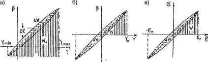 нулевое же значение этого сопротивления отвечает концам петли, то есть деформациям Ymax и Ymin. Площадью петли измеряется в определенном масштабе работа, поглощенная материалом образца за полный цикл деформации и рассеянная им и виде тепла. Отношение этой работы (ΔW) к упругой работе (W0) отвечающей удвоенной амплитуде деформации 2Y0, определяет приближенно энергию, израсходованную за цикл на необратимые (пластические) деформации, в долях к полной энергии за тот же цикл (рис. 2.1, а).