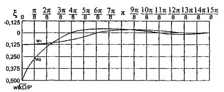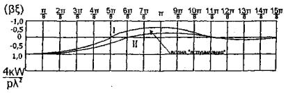 Рис. 9.2. Прогибограмма ледяного покрова при движении груза с первой критической скоростью Кривая I - в направлении движения груза, кривая II - в противоположном направлении ξ. Опытными данными [56] доказано, что в случае, когда скоросд движения груза равна скорости распространения свободной волны (V=C); прогиб под нагрузкой максимально возрастает, то есть имеет место явление резонанса. На рис. 9.3 дан график изменения динамического коэффициента по прогибам для ледяного покрова под нагрузкой в зависимости от скорости ее движения, подсчитанного на основе выражения (9.8), как отношение динамического прогиба к статическому. Статический прогиб получен из (9.8) при скорости V=0.