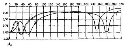 Рис. 9.3. Изменение динамического коэффициента по прогибам в зависимости от скорости движения груза по ледяному покрову График (кривая 1) построен для случая движения груза Р=10,5 т по льду толщиной h=38 см, глубина воды H=6,3 м. Для этих же данных получена экспериментальная кривая [56], которая нанесена на рисунке пунктирной линией. Кривая 2 отражает зависимость динамического коэффициента для льда толщиной 80 см при глубине воды 40 м. Как видно из рис. 9.3, деформация ледяного покрова под движущейся нагрузкой имеет сложный вид. При очень малой скорости движения (до 3-5 км/ч) величина прогиба льда под нагрузкой почти такая же, как и при статическом загружении. Увеличение скорости движения приводит к уменьшению прогиба льда под нагрузкой, это происходит до тех пор, пока скорость достигает приблизительно 0,5 С. При этом прогиб льда имеет минимальную величину (0,5±0,6)wСТ. Дальнейшее увеличение скорости приводит к увеличению прогиба под нагрузкой, так что при V=C динамический прогиб имеет максимальную величину, несколько превышающую статический прогиб. Скорость движения нагрузки, соответствующая образованию максимального прогиба ледяного покрова, будем называть в дальнейшем первой критической скоростью. При этом на расстоянии 71 впереди движущегося груза образуется волна «вспучивания» (рис. 9.2). Движение нагрузки со скоростью V>Vкр1 опять приводит к уменьшению прогиба ледяного покрова под нагрузкой, которое наблюдается до тех пор, пока скорость V≤3 С. Затем с увеличением скорости движения нагрузки прогиб под ней вторично возрастает, достигая второго максимума при Vкр2 - второй критической скорости, величина которой определена в главе 8, п. 8.3, формула (8.11).