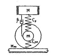 Рис. 10.1. Эквивалентная схема подрессоренной части автомобиля Здесь М - подрессоренная масса, приведенная к вертикальной плоскости над осью колес; m - неподрессоренная масса ведущего моста; Сp - суммарная жесткость рессор подвески данного моста; сшр - суммарная радиальная жесткость шин; β - коэффициент пропорциональности при вязком сопротивлении, имеющем место при колебаниях системы с гидравлическим амортизатором, в котором создается сопротивление движению поршня, зависящее не от перемещения (как это свойственно упругим связям), а от его скорости и пропорционально ее первой степени;