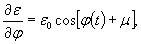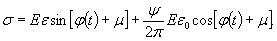 где σ - переменное напряжение; ε - переменная относительная деформация; ε0 - ее амплитуда; Е - модуль упругости материала; ψ - постоянная материала, численно равная коэффициенту поглощения. Должны быть приняты во внимание оба знака корня: знак «плюс» соответствует восходящей ветви петли гистерезиса, знак «минус» - нисходящей ветви. Допустим, что деформация изменяется по закону: ε = ε0sin[φ(t) + μ], (2.11) где φ(t) - непрерывная монотонная функция времени; μ - постоянная. Закон (2.11) описывает колебания гармонического типа с перемен ной частотой. Подставив (2.11) в (2.10), получим: