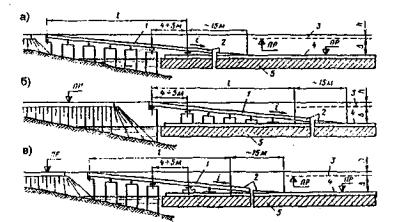 Рис. 1.6. Расчетные эпюры напряжений по толщине ледяного покрова: а - для расчета упругой стадии; б - для расчета упругопластической стадии; в - эпюры для пластической стадии Для полосы льда единичной ширины, значения предельных изгибающих моментов имеют следующий вид: для случая a) M=Rfh2/6; для случая б) M=Rf,yh2/4,8; для случая в) M=Rf,yh2/4. Разница между эпюрами по схемам б) и в) составляет 20%. Следует отметить, что эпюра распределения напряжения (рис. 1.6, б), соответствует схеме расчета ледяного слоя по предельному состоянию с учетом упругопластических деформаций. 1.9. Испытания ледяного слоя на изгиб1.9.1. Испытания ледяного слоя до усиления Эксперименты проводились 19.12.1971 г. при температуре воздуха 6°С. Толщина ледяного слоя h = 8,3 см. Приборы были установлены в мести приложения нагрузки и в 250 см от нее (рис. 1.7).