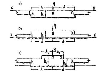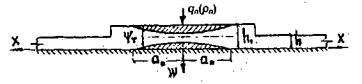 Если с полученными выражениями (9.14)-(9.19) проделать такие же операции, что и в предыдущем параграфе, то получим значения динамических коэффициентов для ступенчатой ледяной плиты как по прогибам, так и по напряжениям. Существенной особенностью в данном случае будет тот факт, что для таких плит теоретически существуют два значения как первой, так и второй критической скорости, потому что толщина плиты на разных участках не одинаковая. Соответственно увеличивается диапазон невыгодных скоростей движения по ледовым переправам такой конструкции. На основании приведенных расчетов и анализа экспериментальных данных [56] можно сделать следующие выводы: 1. Движение нагрузки по ледяному покрову в виде отдельных транспортных единиц следует производить только в одном направлении, если вес транспорта является предельным из расчета грузоподъемности ледяного покрова в упругой стадии. 2. Интервал между отдельными транспортами должен быть таким, чтобы время его преодоления не было близким к величине периода колебаний отдельной прогрессивной волны (9.5). 3. Нельзя допускать у берега (за 50-70 м до него) образования встречных (отраженных) воли, которые могут вызвать сложение амплитуд колебаний. 4. При необходимости организации встречного движении по ледяному покрову, при параллельном движении, расстояние между трассами должно быть не менее 60-80 м при скорости до 20 км/ч, и не менее 200-220 м при скорости движения больше 20 км/ч. ГЛАВА 10. МЕСТНЫЕ ИМПУЛЬСИВНЫЕ ВОЗДЕЙСТВИЯ НА ЛЕДЯНОЙ СЛОЙ10.1. Постановка задачи и цель исследованияВ предыдущей главе рассматривались вопросы динамического расчета ледяного покрова при движении по нему нагрузок в предположении, что ледяной слой имеет идеально гладкую поверхность. В действительности же, в процессе эксплуатации ледовых переправ, как указывалось в главе 6, п. 6.2, появляются различного рода неровности, при проходе через которые движущийся транспорт оказывает дополнительное воздействие на ледяной слой. Особенность этих дополнительных воздействий в том, что действуют они в течение очень короткого промежутка времени, однако численная величина их может быть довольно значительна и в отдельных случаях превышает значения динамических коэффициентов, определенных в главах 7-9. Рассмотрим задачи о проходе массы через местное препятствие, то есть такое препятствие, линейные размеры которого в направлении движения достаточно малы. В пределах этого препятствия необходимо рассмотреть кроме инерционных сил, учтенных ранее, также силы, появляющиеся непосредственно при прохождении массы через препятствия. Введем уже ранее принятую систему координат ξ=x-v t, жестко связанную с движущимся грузом. Как было уже показано, в этом случае однородное дифференциальное уравнение изгиба плиты имеет вид (6.7). В течение всего времени движения по ледяному слою на последний будет воздействовать постоянная сила, определяемая так, как было показано в главе 8, п. 8.2. Кроме этого, в течение промежутка времени, за который груз проходит через, препятствие, на ледяной слой будут действовать дополнительные центробежные силы [75]. Так как наибольший интерес представляет случай быстрого перехода массы через препятствие, будем характеризовать динамическое воздействие этих весьма кратковременных сил их импульсом. Следовательно, задача сводится к пос