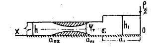 На рис. 9.4 даны графики изменения динамических коэффициентов по напряжениям для уже описанного случая (рис. 9.3, кривая 1). Динамические коэффициенты подсчитаны на основе выражение (9.12) по формулам Изгибающие моменты МСТ(ξ) и МСТ(η) получены из выражений (9.12) при скорости V=0. Как видно из графиков, динамические коэффициенты по напряжению μ(η) больше, чем μ(ξ). Сравнение графиков на рис. 9.3 и 9.4 показывает, что динамические коэффициенты по напряжениям μ(ξ) больше, чем по прогибам μn. Все значения динамических коэффициентов определены для точки под грузом (начало осей координат). Однако, необходимо отметить, что по мере удаления от движущегося груза амплитуда колебаний может увеличиваться и даже превышать прогиб, полученный при статическом нагружении ледяного покрова. Экспериментальными данными [56] установлено, что вдали от трассы движения происходит наложение нескольких волн друг на друга, что в отдельных случаях приводит к значительному увеличению амплитуды колебаний. Интерференция ледяных волн может иметь большое значение при движении нескольких грузов, при обгоне и встрече их. В этом случае может иметь место сложение амплитуд, приводящее к разрушению ледяного покрова. Особенно опасны такие явления при скорости движения, равной скорости распространения свободных воли (V=С). Такого рода явления наблюдались на Ладожской трассе в 1942-1943 гг. Этим можно объяснить случаи внезапного провала автомашин, в то время как до этого проходило значительное количество транспорта по льду, и следующие автомашины безаварийно огибали место провала. 9.4. Колебания ледяного слоя переменной толщины под действием движущегося сосредоточенного грузаРасчетную схему усиленного намораживанием ледяного слоя можно представить в виде бесконечной плиты со ступенчатым изменением жесткости (рис. 4.6). Применяя подстановку η=у-vt, переходим к новой системе координат wxy, движущейся со скоростью V относительно первоначальной системы координат wxy. Считая задачу симметричной относительно оси, направленной вдоль линии движения нагрузки, рассмотрим последовательно два участка плиты (глава 4, п. 4.6). а) для первого участка 0≤λ1x≤a1 с началом координат в точке О, функцию прогиба плиты можно представить в виде