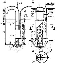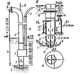 Рис. 2. Схема разработки грунта гидроэлеватором: а - положение гидроэлеватора в котловане; б - схема работы; 1 - грунт; 2 - вода; 3 - гидроэлеватор; 4 - пульпопровод; 5 - резиновый шланг: 6 - трос; 7 - шланг для воды; 8 - водовод; 9 - всасывающая труба; 10 - крышка камеры; 11 - кольцевая щель; 12 - камера; 13 - фланцево-болтовой стык; 14 - стык водовода; 15 - сетка Эрлифт, воздушный водоподъемник, несмотря на сравнительно малый к. п. д (менее 36%), имеет ряд достоинств: простота устройства, надежность и бесперебойность работы. Сжатый воздух под давлением нагнетается по газовой трубе 8 в жидкостную трубу 4, где образуется смесь воздуха с пульпой (эмульсия). Вследствие того, что объемная масса эмульсии меньше массы воды, окружающей эрлифт, под избыточным давлением воды пульпа отжимается по трубе эрлифта вверх (рис. 3). Рабочее давление воздуха, развиваемое компрессором, определяется формулой р ≈ 10(Н-h) кН/м2. Расход воздуха - 1-4 м3 на 1 м3 пульпы.