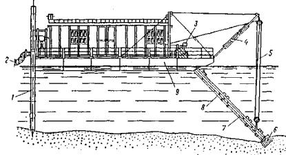 Рис. 3. Схема разработки грунта эрлифтом: а - положение эрлифта в котловане; б - схема работы; 1 - грунт; 2 - вода; 3 - эрлифт; 4 - пульпопровод; 5 - резиновый шланг для пульпы; 6 - трос; 7 - шланг для воздуха; 8 - воздухопровод; 9 - всасывающая труба; 10 - крышка камеры; 11 - камера; 12 - отверстие d = 4-6 мм; 13 -стык пульпопровода; 14 - стык воздухопровода; 15 - сетка Эрлифт, как и гидроэлеватор, подвешивают к крану. Это делают для того, чтобы выбрать оптимальное расположение низа всасывающей трубы по отношению к поверхности разрабатываемого грунта. При этом требуется, чтобы величина заглубления низа эрлифта в воду в 2-3 раза превышала высоту подъема пульпы над уровнем воды в котловане. Производительность гидроэлеваторов и эрлифтов в средних грунтовых условиях - 5 - 20 м3/ч при насыщении пульпы грунтом от 5 до 20%. Для подводных дноуглубительных работ обычно применяют плавучие землесосные снаряды (земснаряды). С их помощью разрабатывается несвязный грунт путем всасывания его из воды. Пульпа забирается центробежным водяным насосом - землесосом и транспортируется по трубам-пульпопроводам. Если всасывание грунта происходит с одновременным механическим рыхлением под водой, то такой способ называется рефулерным. Для дноуглубления обычно применяют земснаряды со свайным папильонированием, которые разрабатывают подводную траншею (прорезь) захватками при последовательном движении от стоянки к стоянке. На каждой стоянке понтон земснаряда «закалывают» сваями в грунт. При вращении (папильонировании) в горизонтальной плоскости вокруг свай земснаряд секторами разрабатывает грунт прорези. Земснаряд (рис. 4, табл. 1) состоит из понтона 9 с землесосом, свай 1. стрелы 4 с приемно-рыхлительным устройством. Оно, в свою очередь, состоит из фермы 7, фрезерного рыхлителя 6 и его привода 3. Для подъема и опускания фермы с рыхлителем имеется лебедка с полиспастом 5. Вращающийся рыхлитель разрушает грунт. Разрыхленный грунт по всасывающему трубопроводу 8 поступает к землесосу, которым транспортируется по пульпопроводу 2 к месту укладки. Земснаряд имеет лебедки для управления носовыми канатами при перемещении земснаряда относительно свай 1 и для подъема-опускания свай.