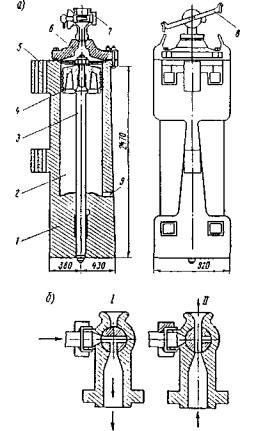 Рис. 5. Паровоздушный молот одиночного действия (пример): а - конструкция молота; б - схема переключения (подачи) пара (воздуха); 1 - корпус; 2 - цилиндр; 3 - шток; 4 - поршень; 5 - фиксаторы молота на копровой стреле; 6 - крышка цилиндра; 7 - трехходовой кран; 8 - рычаг пробки крана; 9 - отверстие для сообщения полости цилиндра с атмосферой (I - в цилиндр молота; II - из цилиндра в атмосферу) Управление работой паровоздушных молотов простого действия полуавтоматическое. Высоту подъема цилиндра можно регулировать, переводя рычаг газораспределения в необходимое положение. В молотах простого действия около 70% массы составляет ударная часть, что является единственным их достоинством. Существенные недостатки - малая производительность и зависимость от внешнего источника энергии (потребность в котельном или компрессорном оборудовании). Паровоздушные молоты одиночного действия традиционно применяли для забивки свай массой до 12-15 т в нескальные грунты любой плотности (табл. 2). Таблица 2 Техническая характеристика паровоздушных молотов одиночного действия