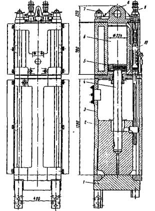 Примечания: 1) первая марка - молот с воздушным, вторая - с водяным охлаждением; 2) выпускают также молоты типа УРБ - быстроходные, с частотой ударов 65 в мин. Основными достоинствами дизель-молотов являются: независимость от внешних источников энергии, быстрота подготовки к работе, невысокая стоимость изготовления, простота и удобство эксплуатации в условиях любых температур, высокая производительность. Однако применение дизель-молотов в зарубежных странах неуклонно сокращается. Предпочтение отдается гидромолотам. Немалую роль в этом играют экологические соображения. Гидромолоты. Тенденцию к созданию молотов повышенной мощности с регулируемой силой удара можно проследить на примере работ голландской фирмы HBG, которая с 1964 года работает над созданием молотов с гидравлическим приводом. С 1969 года она начала серийный выпуск гидромолотов, которые быстро завоевали популярность во всем мире. В гидромолотах подъем ударной части производится регулируемым давлением жидкости. Она подается гидронасосом в пространство под поршнем основного гидроцилиндра, соединенного штоком с ударной частью (рис. 8 и 9). При рабочем ходе ударной части жидкость перетекает через перепускной клапан из полости гидроцилиндра под поршнем в полость над ним, сообщая работе машины эффект двойного действия. Гидравлическая жидкость (минеральное масло или вода) подается гидронасосом производительностью до 400 - 700 л/мин под давлением до 300 - 400 атм.