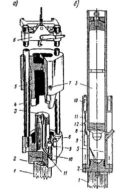 Молоты двойного действия используют для забивки свай и шпунта массой до 6 - 7 т в нескальные грунты любой плотности. Частота ударов молота имеет большое значение. Если они быстро следуют один за другим, изменения в сопротивлении грунта погружению не успевают закончиться между двумя подледовательными ударами. Окружающий сваю грунт будет постоянно разрыхленным, и, следовательно, его сопротивление погружению свай будет пониженным. Благодаря автоматическому парораспределению, частота ударов молотов двойного действия доходит до 130-140 в минуту, что делает их существенно более эффективными и производительными. Кроме того, у молотов двойного действия удобно регулировать силу удара. Молоты имеют закрытый корпус, что обеспечивает возможность их использования для забивки свай, в том числе наклонных, под водой на глубине до 20 м. Паровоздушные молоты широко использовались в отечественной практике в 30-е-50-е годы XX в., но в дальнейшем они уступили первенство дизель-молотам, которые работают автономно, имея более высокие частоту ударов и к.п.д. Но за рубежом паровоздушные молоты продолжают использовать. Там считаются эффективными молоты одиночного действия с массой ударной части до 27 т и энергией удара до 249 кДж, а также молоты двойного действия с соответствующими значениями параметров 18 т и 157 кДж. Их применяют для подводной забивки свай. Эти представления находятся в русле тенденции к возрождению паровых машин. По расчетам специалистов, коэффициент полезного действия паровоза можно поднять до 15%. При этих условиях затраты на эксплуатацию паровых машин станут существенно ниже затрат на двигатели внутреннего сгорания. Современная паровая машина экономична из-за использования микропроцессорных систем автоматического управления, а исключение выбросов в атмосферу и замкнутый цикл придают ей высокую экологичность. Дизель-молоты. Идея создания дизельного молота возникла в СССР в 1928 г., но авторство приписывают немецкому инженеру Шмидту. Начало широкого применения дизель-молотов в нашей стране относится к 1940-м годам. Дизель-молот представляет собой прямодействующий двигатель внутреннего сгорания, работающий по принципу двухтактного дизеля. Ударная часть молота при совершении рабочего хода сжимает заключенный в цилиндре воздух, значительно повышая его температуру. Подаваемая в это время в цилиндр горючая смесь (дизельное топливо) взрывается и отбрасывает ударную часть вверх, совершая холостой ход. При падении ударной части рабочий цикл повторяется и т.д. По типу направляющих для ударной части дизель-молоты делятся на штанговые и трубчатые (рис. 7).