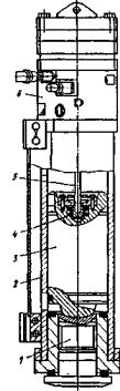 Рис. 8. Гидромолот двойного действия: 1 - шабот; 2 - направляющая труба; 3 - ударная часть; 4 - упругий шарнир (тарельчатые пружины); 5 - шток гидроцилиндра; 6 - рабочий (главный) цилиндр