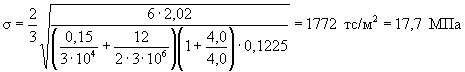 где расчетная несущая способность сваи по грунту определена по формуле (8) СНиП 2.02.03-85* [22]: Fd = 1,0×[1,0×5120×0,1225+1,4×1,0×(8×2+14×2+29×2+32×2+63,5×2+66×1)] = 1130 кН. Пытливый читатель должен был заметить, что второй множитель в формуле (12) представляет собой определенный ранее к.п.д. удара η. Так что Еhη = Ed = 20,2 кДж. Вычисленное значение отказа сваи является контролируемым параметром технологического процесса и указывается в проекте производства работ. Наконец, для принятого молота, который удовлетворяет всем предыдущим условиям, проверяем условие (13) бездефектного погружения сваи. Полагаем, что забивка производится с наголовником, имеющим деревянную прокладку толщиной s = 0,15 м; модуль деформации древесины - Es = 3×104 тс/м2. Класс бетона сваи по прочности - В30 (Eb = 3×106 тс/м2). По формуле (1.7) [21] рассчитываем сжимающие напряжения в голове сваи при забивке: