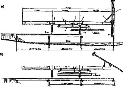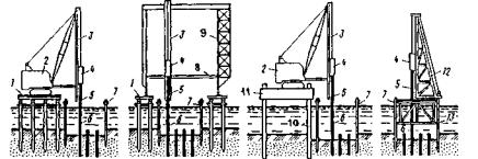Рис. 10. Использование временных подмостей для производства свайных работ: 1 - подмости: 2 - стреловой крап: 3 - копровая стрела; 4 - молот; 5 - подбабок; 6 - свая: 7 - шпунт: 8 - распорка: 9 - портальный кран; 10 - стойки; 11 - самоподъемная платформа; 12 - копер; 13 - направляющий каркас