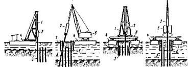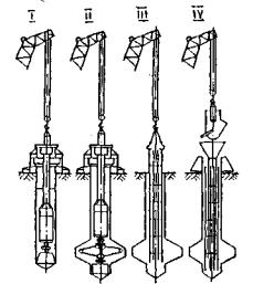 Полное (чистое) время погружения одной сваи-оболочки (при выполнении всех предусмотренных выше технологических мероприятий) равно tп = 5,4+6,8+4,7 = 17 мин. Заметим, что в общем времени tпогр цикла погружения оболочки, определяемом по формуле (21), чистое время погружения составляет весьма незначительную часть, так как остальные компоненты формулы исчисляются часами. Тем не менее, изложенная выше методика прогнозирования вибропогружения свай играет важную роль. Она позволяет оценить погружающую способность вибраторов и проверить возможность применения различных технологических приемов, улучшающих процесс погружения. 5.3. Агрегаты для возведения фундаментов из буронабивных свайОсобенностью технологии работ по сооружению свай этого типа является монолитное подводное бетонирование свай непосредственно в грунте в проектном положении. Сначала в грунте тем или иным способом делают скважину (при необходимости с уширением), затем устанавливают в нее арматурный каркас и укладывают бетонную смесь (рис. 21).