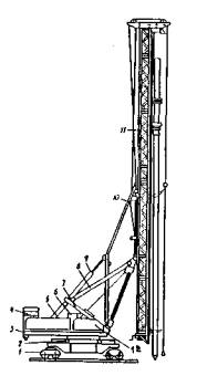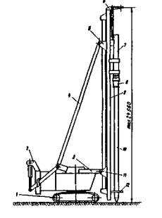Рис. 12. Рельсовый копер СП-69: 1 - ходовая часть; 2 - опорно-поворотный круг; 3 - поворотная платформа; 4 - противовес; 5 - задняя стойка; 6 - кабина машиниста; 7 - передняя стойка; 8, 9 - гидроцилиндры; 10 - параллелограмм; 11 - мачта; 12 - лебедки