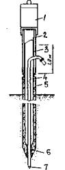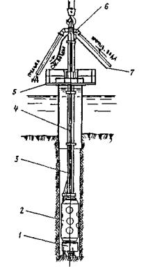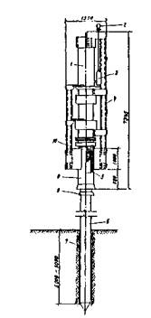 Рис. 26. Агрегат подвесной бурильный с четырехшпиндельным укороченным электробуром: 1 - планетарный редуктор с бурильными инструментами; 2 - центратор; 3 - переходник; 4 - бурильная штанга; 5 - реактивная рама; 6 - наголовник; 7 - токоподводящий кабель Из-за этого возникает необходимость применения особых технологий. Неоднократно предпринимались попытки подводной укладки бетонной смеси с вибрированием. В последние годы отечественными инженерами разработан и применяется комплект бетонолитного оборудования с использованием виброштампа (рис. 27). При этом способе подача бетонной смеси по вертикальной бетонолитной трубе может производиться как из бункера, так и бетононасосом. По мере подачи бетонной смеси и проработки ее виброштампом обсадную трубу постепенно извлекают из скважины. Применение установки для укладки с вибрированием позволяет повысить прочность бетона сваи в 1,2-1,5 раза, а также несущую способность свай по грунту на 20-30%.
