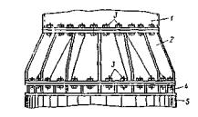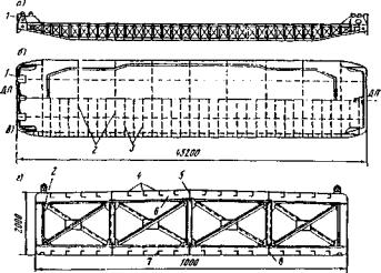 Рис. 55. Прицеп-балковоз ПТ-75: 1 - тягач К-701; 2 - тележка прицепная; 3 - перекрестные тросовые тяги; 4 - перевозимая балка; 5 - платформа (скоба) Кроме того, специальные тележки-балковозы могут входить в комплект консолыю-шлюзовых кранов и др. Специфическими для мостостроения являются работы на акваториях рек. В строительстве мостов применяют разнообразные плавучие средства для перевозки грузов с причалов к месту сооружения опор или с берега на берег реки. В отдельных случаях используют временные наплавные мосты. Кроме того, плавучие средства могут использоваться для установки на них сухопутных кранов и копров (см. п. 6.5 и приложение). Применяют плавучие средства двух основных типов: баржи речного флота и сборно-разборные плашкоуты из инвентарных понтонов. Как правило, мостостроители используют арендуемые баржи. Инвентарные понтоны - собственные или арендуемые средства. Баржи бывают самоходными и несамоходными [26]. Несамоходные баржи и плашкоуты из понтонов транспортируются буксирами. Для водных путей страны типичны баржи-площадки (рис. 56) с грузоподъемностью 300, 600 и 1000 т. Ранее их строили большими сериями. Прочность палубы, как правило, достаточна для погрузки техники.