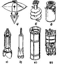 Рис. 22. Виды бурильного инструмента и оборудования: а - лопастной бур; б - шнековый бур; в - ковшовый бур; г - грейфер; д - ударное долото; е - обсадная труба; ж - шарошечное долото Разработку скальных грунтов в скважинах производят ударным способом при помощи долота (рис. 22, д) или вращательным бурением шарошечным инструментом (рис. 22, ж). Долото подвешивают на канате к мачте агрегата ударно-канатного бурения и сбрасывают с высоты. Буровой шлам удаляют из скважины, промывая ее специальным устройством (рис. 24).