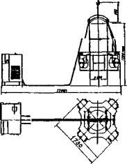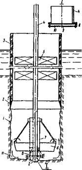 Бурение скважин шарошечным инструментом производят при помощи агрегатов с погружными забойными двигателями, оснащенных турбобурами или электробурами. Агрегаты, смонтированные на базе серийных турбобуров Т12РТ-240, которые используются в горной промышленности, позволяют производить разбуривание скважин диаметром до 1,3 м на глубину до 30 м. Агрегат с реактивно-турбинным буром РТБ2600 осуществляет проходку скважин диаметром 2,6-2,83 м неограниченной глубины (рис. 25). Агрегат состоит из четырех турбобуров, смонтированных на единой раме и снабженных трехшарошечными долотами, которые вращает с частотой около 600 об/мин реактивная струя воды. Забой скважины очищается от выбуренного грунта потоком жидкости, выходящей из долот, с прямой промывкой скважины и периодическим эрлиф-тированием. Мощность турбобуров больше, чем мощность станков ударно-каначчого бурения. Поэтому РТБ целесообразно использовать при устройстве значительного числа скважин большого диаметра. Вместе с тем, бурильные агрегаты с турбобурами обладают низким к.п.д., требуют большого расхода чистой воды, имеют низкий крутящий момент на буровом инструменте. Агрегаты с погружным электрическим двигателем более эффективны, чем турбобуры.