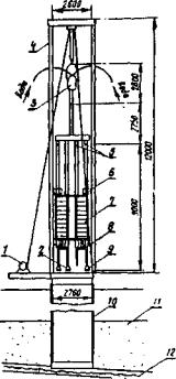 Рис. 25. Агрегат с реактивно-турбинным буром РТБ-2600; 1 - электролебедка; 2 - долото диаметром 750 мм; 3 - вертлюг; 4 - вышка; 5 - турбобуры; 6 - верхние центраторы; 7 - нригруз; 8 - нижние центраторы; 9 - долото диаметром 490 мм; 10 - оболочка; 11 - грунт; 12 - скальная порода В частности, подвесной бурильный агрегат отечественного производства с четырехшпиндельным укороченным электробуром применяют для вращательного шарошечного бурения с промывкой вертикальных скважин диаметром 1,3 - 1,65 м глубиной до 56 м (рис. 26). Подводное бетонирование обычно производят способом вертикально перемещающейся трубы (ВПТ) [7], который, однако, не позволяет получать требуемые классы по прочности и водонепроницаемости и необходимое качество бетона буронабивных свай.