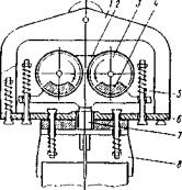 При подводном бетонировании скважин способом ВПТ в качестве ведущей машины, выступающей в партнерстве с буровым агрегатом, применяют стреловой самоходный кран с бункером или бетононасос. 5.4. Вспомогательное оборудованиеПри сооружении свайных фундаментов в качестве вспомогательного оборудования применяют устройства для погружения и извлечения шпунта; для облегчения погружения свай в грунт; для срезки голов свай; для откачки воды из котлованов, водопонижения и др. Устройства для погружения и извлечения шпунта бывают двух основных типов: вибромолоты и домкратные установки. Вибромолоты основаны на принципе преобразования вибрационных воздействий в ударные (рис. 30). При синхронном вращении эксцентриков в разные стороны возникает направленная по оси погружаемого элемента периодическая вынуждающая сила, под действием которой ударная часть колеблется на пружинах, нанося удары по наковальне. Ударные импульсы передаются погружаемому элементу через наголовник. При извлечении шпунта используются вибрация и направленная вверх вынуждающая сила, создаваемые вращением эксцентриков в сторону, обратную погружению.