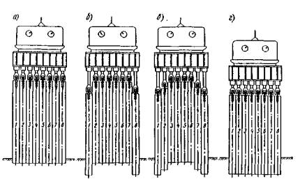 Рис. 31. Схема работы агрегата Tiewood по задавлнваншо стального шпунта (1 - 8 - шпуптины): а-г - схемы производства работ Эффективным средством улучшения погружения свай и свай-оболочек является подмыв водой. Для этого применяют высоконапорные иглы и многоступенчатые центробежные насосы типа ЦНС с расходом воды до 5 м3/мин и давлением до 33 МПа. В сваях-оболочках малого диаметра подмывная труба вставляется внутрь («центральный подмыв» - рис. 32).