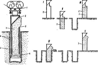 Рис. 36. Схема разработки скважин трубчатыми лидерами (I-V - последовательность операций): 1 - вибромолот; 2 - лидер; 3 - отверстие для выхода грунта в лидерной скважине; 4 - наконечник лидера; 5 - мерзлый грунт; 6 - зазоры между мерзлым грунтом и лидером; 7 - грунтовый керн Из-за достаточно низких физико-механических характеристик ВМГ при использовании обоих принципов, как правило, устраивают свайные фундаменты. В случае применения принципа I сваи погружают забивкой в предварительно пробуренные лидерные скважины меньшего диаметра или же устанавливают готовые свайные элементы (буроопускные столбы) в скважины большего диаметра, заполняя полость различными смесями (цементно-песчаным раствором, пескоцементом и др.). Чтобы образовать лидерные скважины, используют обычную буровую технику для скальных пород (см. п. 5.3), а также специальные трубчатые лидеры (рис. 36), виброгрейферы, виброударные машины на базе тракторов, оборудованные вибромолотами (рис. 37) [23].