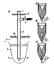 Рис. 38. Паровая игла (а) и наконечники (б-г): 1 - заглушка; 2 - рукоятка; 3 - тройник; 4 - гибкий шланг; 5 - труба; 6 - наконечник; 7 - вечномерзлый грунт; 8 - оттаянный грунт; 9 - сезонномерзлый грунт; 10 - лунка