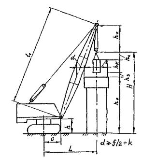 Рис. 41. Схема монтажа конструкции (к примеру 4) Необходимая длина стрелы lс ≈ 1,5×13 = 19,5 м. По справочнику [24] принимаем кран с длиной стрелы 20 м (с. 57, рис. 3.26). Путем графического построения при выполнении условия (28) получен минимально возможный вылет стрелы L = 9 м. Условие (29) соблюдается: Lmin = 5,5 м ≤ L ≤ Lmax = 17 м. По грузовысотным характеристикам (рис. 3.27, кривая 11) G(L) = 13 т, т.е. условие (26) соблюдено. По кривой 10 - Н(L) = 19 м > Н3 = 13 м, т.е. выполняются и условия (27), (30). Таким образом, пневмоколесный кран КС-6362 с длиной стрелы 20 м может выполнить требуемую монтажную операцию. В России и странах ближнего зарубежья серийно выпускаются автомобильные краны грузоподъемностью 4-16 т, пневмоколесные - 16-100 т, гусеничные - 16-150 т, на спецшасси автомобильного типа - 25-160 т. Имеются опытные образцы кранов на спецшасси грузоподъемностью до 250 т. Довольно широко применяются также краны японских фирм на специальном шасси нормальной базы фирмы Kato грузоподъемностью 16-120 т, гусеничные краны фирм Hittachi и Sumitomo, германские краны Liebherr, финские Lokomo - грузоподъемностью до 250 т. Известны случаи осуществления уникальных монтажных операций кранами на спецшасси грузоподъемностью до 650 т. Таблица 17 Техническая характеристика железнодорожных кранов типа ЕДК (Германия)