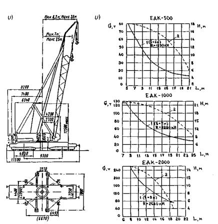 Рис. 42. Железнодорожный кран ЕДК-1000 грузоподъемностью 125 т (а) и грузовысотные характеристики кранов ЕДК (б): 1 - график G = f1,(L) для главного подъема при работе па выносных опорах с максимальной базой b; 2 - график Н = f2(L) для главного подъема; R - максимальная сила давления аутригера на опору 6.3. Специализированные универсальные краныВ промышленности, строительстве и на транспорте применяется широкий класс козловых кранов, предназначенных в основном для погрузочно-разгрузочных работ на складах. Но это обычно краны невысокой грузоподъемности (5-15 т). Поэтому для строительства мостов еще в 1950-х гг. были созданы специальные козловые краны К-451, К-451М и К-651 грузоподъемностью 45 т и 65 т, которые помимо обслуживания полигонов, баз, складов могут применяться и в технологических целях - для сооружения опор и монтажа пролетных строений с земли и эстакад. В отличие от стреловых кранов жестконогие деррик-краны - несамоходные и неполноповоротные [24], просты в устройстве и неприхотливы в эксплуатации. Кроме того, их собственный вес невелик. В настоящее время применяют краны отечественного производства УМК-2М, ДК-25-3С, ДК-40/10 грузоподъемностью 25 т и 40 т - для навесного монтажа стальных пролетных строений. Также используют кран МДК-63 грузоподъемностью 63 т, обычно устанавливаемый на плашкоуты (см. п. 6.4). Кроме того, деррик-краны, установленные на временные опоры, могут обслуживать причалы и склады на строительной площадке. 6.4. Специальные краны и монтажные агрегатыДля строительства мостов созданы и применяются следующие серии отечественных специальных кранов. Консольные краны. Железнодорожные консольные краны марок ПВК-70, ГЭК-80, ГЭПК-130У предназначены для установки на опоры цельнопролетных или укрупненных блоков пролетных строений железнодорожных мостов длиной до 45 м (см. [24]). Недостаток кранов ПВК-70 и ГЭК-80 состоит в том, что они неиоворотиы, т.е. могут устанавливать блок пролетного строения только по оси пути. Поэтому в настоящее время применяется только кран ГЭПК-130У. Но его недостатками являются: большой собственный вес; нагрузка на ось в рабочем положении до 400 кН и, в связи с этим, повышенные требования к подготовке пути; необходимость в ряде случаев устройства предмостовых тупиков. Кроме того для монтажа балочных пролетных строений длиной до 34,2 м, массой до 52,5 т и блоков опор может применяться облегченный сборно-разборный консольный кран СРК-НЛ-50 (рис. 43). Собственная масса крана составляет 54 т, рабочая нагрузка на ось - не более 200 кН.