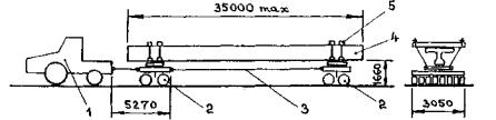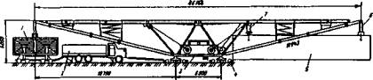 Рис. 54. Самоподъемная плавучая платформа (пример строительства моста через оз. Маракайбо в Венесуэле) Следует иметь в виду, что грузовысотные характеристики сухопутного крана, установленного на плашкоут, в ряде случаев по сравнению с работой крана на ровной горизонтальной поверхности меняются в худшую сторону из-за влияния на его устойчивость крена и дифферента плавсистемы при работе на воде (рис. 53). Краны на самоподьемных платформах. Плавучие самоподъемные платформы являются эффективным вспомогательным сооружением, в первую очередь, для возведения опор. Самоподъемная платформа имеет плашкоут и опорные колонны с подъемными установками (рис. 54). Платформу транспортируют к месту сооружения опоры, где временно расчаливают. После этого работой подъемных домкратов при упоре опорных колонн в грунт дна производится подъем плашкоута над водой. Опорные колонны могут иметь внизу башмаки или заглубляться в грунт. Поднятый над водой плашкоут превращается в стационарную рабочую площадку, которая может служить для установки грузоподъемных кранов, размещения складов, оборудования и прочего оснащения. 7. ТРАНСПОРТ НА СТРОИТЕЛЬСТВЕ МОСТОВНа строительстве мостов используют обычные средства наземного транспорта - железнодорожный и автомобильный подвижной состав. Тип и марку транспортного средства в каждом конкретном случае подбирают с учетом массы, габаритов и условий перевозки груза. Значительную трудность составляет перевозка по местным и временным автомобильным дорогам таких крупногабаритных грузов, как балки и блоки железобетонных и металлических пролетных строений, секции свай-оболочек большого диаметра и др. Для этого приходится приспосабливать существующие автомобильные прицепы-тяжеловозы и трейлеры грузоподъемностью до 60-70 т, предназначенные для перевозки строительной техники, а в некоторых случаях создавать специальные транспортные средства. Например, имеются прицепы-балковозы Р-6333 грузоподъемностью 63 т Тайшетского РМЗ и ПТ-75 грузоподъемностью 75 т Золотоношского РМЗ (Украина), предназначенные для транспортировки железобетонных балок автодорожных мостов длиной до 33 м (рис. 55).