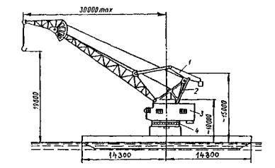 Рис. 45. Плавучий кран КПЛ-5/30: 1 - коромысло и противовес стрелы; 2 - тяга изменения вылета стрелы; 3 - машинное отделение с кабиной управления; 4 - поворотный механизм