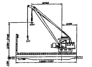 Установка сухопутных кранов на плавсредства. Для формирования плавучих крановых установок из сухопутных кранов (автомобильных, гусеничных, пневмоколесных, козловых и деррик-кранов) могут использоваться плашкоуты различного типа: из барж речного и морского флота, сборно-разборных понтонов мостового парка типа КС, понтонов наплавных мостов типа ПЖМ-56 и др. (см. раздел 7). Тип плашкоута принимается в зависимости от конкретных местных условий.
