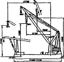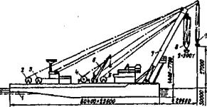 Рис. 50. Плавучий кран «Витязь»: 1 - понтон; 2 - лебедка изменения вылета стрелы; 3 - лебедка палубных талей грузоподъемностью 2×200 т (используется при подъеме грузов массой 1600 т); 4 - лебедка вспомогательного подъема; 5 - судовой кран; 6 - лебедка главного подъема; 7 - стрела; 8, 9 - подвески соответственно главного и вспомогательного подъемов Плавучие самоходные краны имеют штатные расчалочные устройства - якоря или сваи, которыми они закрепляются за дно реки. Специализированные сборно-разборные краны. Отечественные краны этого типа (табл. 19) предназначены и серийно выпускались специально для мостовых организаций. Они просты по конструкции - плашкоут с треугольной стрелой, вращающейся только в вертикальной плоскости, т.е. это - шевр-краны (рис. 51). На стрелу сборно-разборного крана можно навешивать копровую стрелу, превращая его в плавучий копер. Но это несамоходные и неповоротные краны, их перемещение происходит якорными лебедками. Поэтому у них малая маневренность и производительность, они требуют специальных расчалочных устройств, сужающих фарватер на реке и препятствующих судоходству (рис. 52). Поэтому плавучие краны первой и третьей групп более предпочтительны. Таблица 19 Техническая характеристика сборно-разборных плавучих кранов