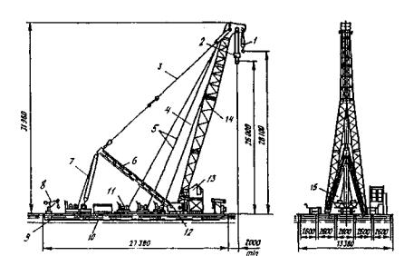 Рис. 51. Плавучий разборный кран ПРК-80: 1, 2 - подвески главного и вспомогательного полиспастов соответственно; 3 - оттяжка стреловая: 4, 5 - трос лебедки вспомогательного и главного полиспастов соответственно; 6 - стойка качающаяся; 7 - полиспаст стреловой; 8 - крамбол; 9 - плашкоут; 10 - электростанция; 11 - лебедка грузовая с тяговым усилием 8 тс (4 шт.); 12 - узел опорный; 13 - кабина управления; 14 - стрела; 15 - установка манипуляторной лебедки