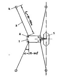 Рис. 52. Схема расчаливания плавкрана второй или третьей группы при сооружении опоры; 1 - плавкран; 2 - якорные лебедки: 3 - расчалки из стальных канатов; 4 - железобетонные якоря-присосы; 5 - опора