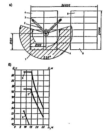 Рис. 39. Перфорированная паровая игла: 1 - труба; 2 - отверстия; 3 - заглушка; 4 - рукоятка; 5 - гибкий шланг На одну иглу требуется обеспечить 4-5 м2 поверхности нагрева котла. Паровые иглы изготавливают из труб диаметром 25 - 30 мм и длиной до 8 м. 6. ГРУЗОПОДЪЕМНЫЕ МАШИНЫДля отечественного мостостроения характерно создание и широкое применение наряду с общестроительными кранами различных грузоподъемных кранов специального назначения. Это объясняется особенностями технологии мостовых работ и неблагоприятными условиями для применения в ряде случаев общестроительных кранов. Основные типы и марки современных кранов рассмотрены в [10] - [14] и др. В данном разделе приводятся дополнительные сведения о грузоподъемных машинах специального назначения, которые обычно малодоступны студентам. 6.1. Типы грузоподъемных крановПо области применения и эксплуатационным условиям краны для строительства мостов можно разделить на три группы [24]. Первую группу составляют стреловые самоходные полноповоротные краны общего назначения на спецшасси, автомобильном, пневмоколесном, гусеничном и железнодорожном ходу. В отдельных случаях используют также башенные краны (приставные, самоподъемные и передвижные). Краны этой группы применяют наиболее широко. Их особенности - автономность работы, быстрота и низкая трудоемкость приведения из транспортного в рабочее положение, но сравнительно высокая стоимость. Во вторую группу входят специализированные универсальные краны: козловые и жестконогие деррик-краны. Их отличительные особенности: более узкая область применения, питание двигателей от внешних источников, меньшая стоимость, но и повышенные трудозатраты, а также стоимость приведения в рабочее положение. Третья группа - специальные краны, предназначенные для производства работ в особых условиях. К ним относятся консольные, консольно-шлюзовые и кабельные краны, специальные монтажные агрегаты. Особую группу составляют плавучие краны - непременный атрибут строительства любого большого моста. Сюда же можно отнести краны на самоподъемных платформах и некоторые другие. 6.2. Стреловые самоходные краны общего назначенияСтреловые самоходные краны являются одним из наиболее универсальных средств механизации строительно-монтажных работ. Многообразие существующих конструкций и типоразмеров кранов дает возможность рационального выбора крана, наиболее соответствующего условиям его работы в конкретных условиях. Основными факторами, определяющими грузоподъемные возможности стрелового крана, являются устойчивость положения крана при действии опрокидывающего грузового момента и высота подъема крюка крана относительно уровня его стоянки. Влияние указанных факторов графически представляется в виде номограмм грузовысотных характеристик, т.е. совмещенных графиков зависимостей G = f1(L) и Н = f2(L), где G - грузоподъемность крана, т; H - высота подъема крюка, м; L - вылет крюка, м (рис. 40). Грузовысотные характеристики даны в справочниках для каждого крана при работе его как без выносных опор (аутригеров), так и на них, для разных длин стрелы lс крана. Кривые высоты подъема груза заданного габарита В рассчитаны по приведенной ниже методике, пригодной для любого стрелового крана. Высота подъема верхней кромки груза где l - расчетная длина стрелы крана; L - вылет крюка; с - рас