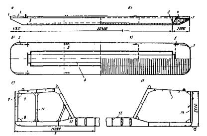 Рис. 57. Бункерная баржа для перевозки каменных материалов: а - вид с борта; б - продольный разрез корпуса; в - вид сверху; г - план набора днища (нижняя часть); д - поперечный разрез по рамному шпангоуту; с - то же, но холостому шпангоуту; 1 - транец; 2 - фальшборт; 3 - поперечная переборка; 4 - раскосы продольной фермы; 5 - кнехты; 6 - грузовой бункер; 7 - карлингс; 8 - кница (узловая фасонка); 9 - рамный шпангоут; 10 - бимс; 11 - пиллерс (стойка); 12 - кильсон; 13 - флор; 14 - холостой шпангоут; 15 - скуловой лист обшивки Открытые и бункерные баржи (рис. 57) составляют вторую по распространенности группу. Грузоподъемность их колеблется в пределах от 1000 до 4500 т, хотя встречаются суда и меньшего тоннажа - 150…600 т. Прочность трюмных барж обычно зависит от целости поперечных переборок, распорок и комингсов. Палубные баржи и лихтеры (баржи с грузовыми стрелами) имеют люки не на всю площадь трюмов. Прочность палуб, как правило, сильно ограничивает вес устанавливаемого груза. Для сборки транспортных и иных плашкоутов применяют инвентарные металлические понтоны закрытого типа (табл. 20). Понтоны первых трех марок в табл. 20 предназначены для мостостроения, а последние три конструкции могут заимствоваться из имущества мостовых парков для временных и краткосрочных наплавных мостов. Таблица 20 Техническая характеристика инвентарных металлических понтонов