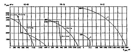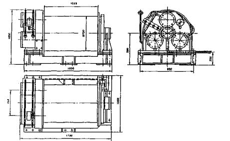 Рис. 59. Графики предельно допускаемых усилий Мдоп и Qдоп, на понтоны: 1 - основное сечение понтона; 2 - сечение по стыку При конструировании плашкоутов, кроме расчета на плавучесть и остойчивость [24] - [26]; необходимо выполнить проверку прочности плашкоута как балки на упругом основании по общему изгибу (рис. 59) и по местным сосредоточенным нагрузкам (рис. 58, а-в). Плашкоуты из понтонов оснащают кнехтами, кранцами и транцами для швартовки, лебедками и киповыми планками для расчаливания и перемещения на небольшие расстояния, аварийными якорями и насосами для откачки воды при повреждении обшивки понтонов. Необходимую для перемещения плавучих средств мощность буксиров определяют по формуле где W - расчетная сила давления ветра на надводную часть плавсистемы, принимаемая при максимальной скорости ветра v = 10 м/с, исходя из интенсивности давления 180 Н/м2 площади надводной части плавсистемы; N - расчетная гидродинамическая нагрузка на подводную часть плавсистемы; Р - удельная сила тяги буксира, принимаемая равной 100-150 Н/л. с. (120-200 Н/кВт). Гидродинамическое давление воды на подводную часть плавсистемы принимается равным N = Nл+Nт, (32) где Nл - лобовое давление воды, Н, равное Nт - сила трения воды по поверхности плавающего тела, H, определяемая по формуле где φ0 - коэффициент, принимаемый равным 0,75 для закругленного очертания судна и 1,0 - для прямоугольного очертания; F - подводная площадь по миделю (наиболее широкому поперечному сечению), м2; v - максимальная относительная скорость перемещения воды и плавсредства, м/с; f = 0,17 - коэффициент трения воды по металлической поверхности судна; S - площадь смоченной поверхности (поверхность трения воды), м2. Значения F и S для плашкоутов и барж принимаются равными где t, В и L - соответственно осадка, ширина и длина судна, м. Помимо давления текущей воды учитывают нагрузку от воздействия волн: 300 Н/м для рек шириной 300-500 м и 1200 Н/м - при ширине 500 м и более. 8. ПОДЪЕМНО-ТРАНСПОРТНОЕ ОБОРУДОВАНИЕОдним из основных факторов, обеспечивающих высокую производительность, надежность и безопасность монтажных работ, является технически грамотное применение малого подъемно-транспортного оборудования. К числу таких вспомогательных машин и механизмов, применяемых на любом строительстве мостов, относятся: лебедки, такелажное оборудование, строповочные устройства, домкраты и др. 8.1. Лебедки и такелажное оборудованиеЛебедки - простые грузоподъемные машины, состоящие из приводного барабана и стального каната, наматываемого на барабан при рабочем ходе лебедки и сматываемого с барабана при холостом ходе. Лебедки могут быть с ручным или механическим приводом (рис. 60, а, б). Кроме того, используют фрикционные лебедки, у которых есть тормоз, позволяющий быстро освобождать барабан для свободного разматывания каната (рис. 60, б). Такие лебедки необходимы в сваебойных агрегатах со свободно падающей ударной частью, в установках для подводного бетонирования способом ВПТ; их устанавливают на кранах. Во всех механических лебедках скорость перемещения каната постоянна, если в редукторе нет коробки передач. Основными характеристиками лебедок, помимо скорости навивки каната, являются грузоподъемность (максимальное тяговое усилие), канатоемкость, т.е. длина каната, который может быть уложен на барабане, и диаметр каната.