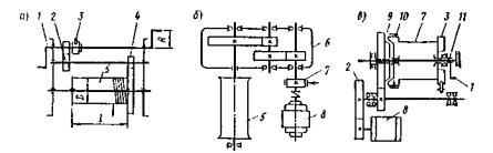 Рис. 60. Схемы лебедок: a - барабанная с ручным приводом; б - электрореверсивная; в - фрикционная; 1 - рукоять; 2, 4 - зубчатые передачи; 3 - храповик; 5 - барабан; 6 - редуктор; 7 - тормоз; 8 - электродвигатель; 9 - фрикционная муфта; 10 - тормоз ленточный; 11 - гайка Отечественной промышленностью выпускаются лебедки ручные монтажные под диаметр каната 6,2-21 мм с тяговым усилием 2,5 - 50 кН и канатоемкостью 35-200 м (см. [24]). В мостостроении такие лебедки (ТЛ-3А или ТЛ-5А) применяют для оборудования плавсистем. Из электрических лебедок используют преимущественно марки ПЛ-5-68 и ЛК-8 с тяговым усилием 50 и 80 кН, скоростью навивки каната 30 и 6 м/с, канатоемкость 450 и 200 м, диаметром каната 21 и 28 мм соответственно. Электрические лебедки, как правило, применяют для перемещения грузов по горизонтали. В такелажных устройствах в качестве тягового органа используют стальные канаты. Канаты изготавливаются путем свивки отдельных проволочек из углеродистой стали. Они могут быть одинарной и двойной свивки, односторонней, крестовой и комбинированной свивки (рис 61). Шагом свивки каната называется расстояние между двумя метками, в которое укладывается число витков, равное числу прядей в канате. Канаты крестовой свивки более устойчивы к раскручиванию. По расположению проволок канаты бывают с точечным касанием проволок между слоями прядей (ТК), с линейным касанием (ЛК), а также с точечным и линейным касанием проволок в прядях (ТЛК). Канаты типа ТЛК наиболее прочные и износостойкие, рекомендуются для такелажных устройств. Диаметр каната подбирают по разрывному усилию Р, определяемому в зависимости от нормативного усилия натяжения каната S: где k - коэффициент запаса прочности каната [24, табл. 2.1]; [Р] - предельно допустимое разрывное усилие по ГОСТ или сертификату завода-изготовителя.