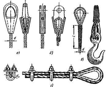 Рис. 61. Свивка канатов: а - параллельная; б - крестовая; в - комбинированная; l - шаг свивки P = Sk ≤ [P], (36) Срок службы стального каната колеблется от нескольких недель до нескольких лет. Он зависит от его конструкции, условий работы и хранения. При появлении обрывов проволок канаты подлежат браковке согласно «Правилам устройства и безопасной эксплуатации грузоподъемных кранов». Для закрепления концов стальных канатов к различным частям подъемных или тяговых механизмов и строповки пользуются различными приемами (рис. 62). При этом используют стандартные детали крепления канатов (коуши, сжимы, зажимы, клиновые втулки и пр.). Имеющиеся лебедки развивают относительно небольшие тяговые усилия (до 50-80 кН). Но в ряде технологий, таких как продольная и поперечная передвижка, подъемка пролетных строений и др., возникает необходимость в приложении значительно больших сил. Увеличение тягового усилия во много раз при неизменном тяговом усилии лебедки возможно за счет применения специального механизма - полиспаста.