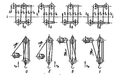 Рис. 63. Схемы одинарных полиспастов: а, б - с ветвью, сходящей с неподвижного блока; в г, - с ветвью, сходящей с подвижного блока Усилие в любой нитке полиспаста Sk определяется по формуле Sk = (f-1)fi-k Q/(fi-1) = akQ, (38) где f - коэффициент, учитывающий потери от трения в подшипниках блока и жесткости каната (f = 1,02 для блоков на подшипниках качения и f = 1,04 - для блоков на бронзовых втулках); k - номер нитки (ветви) полиспаста; i - кратность полиспаста; Q - тяговое усилие или вес груза, кН. Для выбора каната, блоков полиспаста и подбора лебедки необходимо определить усилие натяжения ветви каната, сходящей с последнего блока и идущей к барабану лебедки. При известной схеме полиспаста можно решить обратную задачу, т.е. определить тяговое усилие полиспаста Q по усилию в канате лебедки S1: Q = S1/α1. (39)
