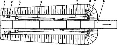 Рис. 74. Схема действия гидравлического домкрата непрерывного подъема