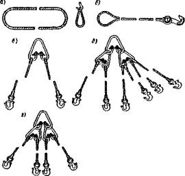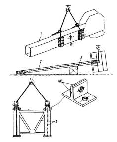 Рис. 68. Строповка элементов пролетного строения: 1 - нижний пояс; 2 - стойка (подвеска); 3 - шпальная клетка; 4 - уголковый захват; 5 - панель продольных балок Стропы изготавливают из кусков стального каната нужного диаметра. По конструкции стропы можно разделить на универсальные, облегченные и многоветвевые (рис. 69). Методика расчета строповочных устройств изложена в [24].